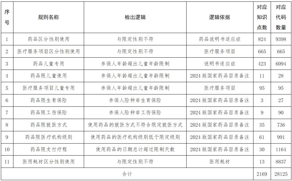 本次公开“药品区分性别使用”“医疗服务项目区分性别使用”“药品儿童专用”“药品限儿童使用”“医疗服务项目儿童使用”“药品限生育保险”“药品限工伤保险”“药品限就医方式”“药品限机构级别”“药品限支付疗程”“医用耗材区分性别使用”共11类规则对应知识点明细(共计28125条),适用于全省所有定点医疗机构与定点零售药店。